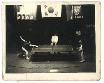 대구 국립극장 무대에서 열린 탁구 시범경기를 찍은 사진(왼쪽: 김영숙 선수, 1958년 경)
