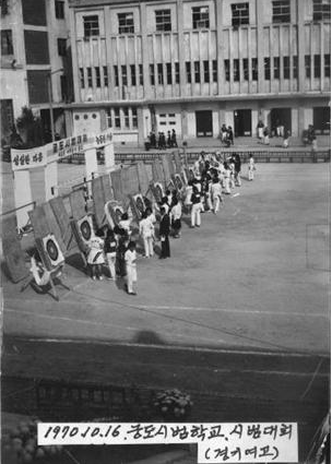 이 사진은 1970년 10월 16~17일에 경기여고에서 열린 첫 양궁시범학교 대항 시범대회 모습으로, 경기 후 선수와 경기위원들이 표적지에 모여 성적을 확인하고 있다. 당시 대회에 경기여고, 서울여고, 인일여고, 경주여고 등을 포함한 15개 학교, 125명의 선수가 출전했다. 경기는 30m와 20m 더블라운드 방식으로 실시되었고 접점 끝에 광주여고가 우승을 차지했다. 이 사진을 기증한 김형탁 원장(김형탁양궁훈련원)도 경주여고 감독으로 사진 속 시범대회에 참가했었다고 한다. 그는 경주여고에서 처음으로 양궁 지도자 생활을 시작했고, 14년 후 1984년 LA올림픽에서 양궁 금메달(서향순)과 동메달(김진호)을 획득하는데 있어서 감독으로서 큰 역할을 했다. 그 외에도 이곳에는 최초 국가대표코치를 지낸 박애성, 한국신기록을 최초로 수립한 오영숙도 참가했었다고 한다.